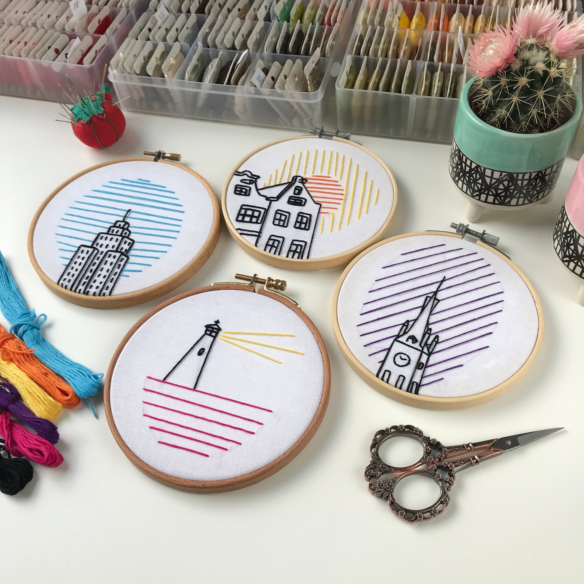 BUNDLE! 4 Architectural patterns for beginners, perfect for creating stunning hoop art and wall decor. The bundle includes detailed instructions and a video tutorial to guide you through the embroidery process.
