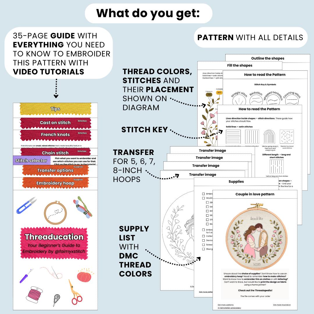 Celebrate love in stitches with this romantic hand embroidery PDF pattern featuring a couple surrounded by blooming flowers – a perfect gift for weddings, engagements, anniversaries, or just because.