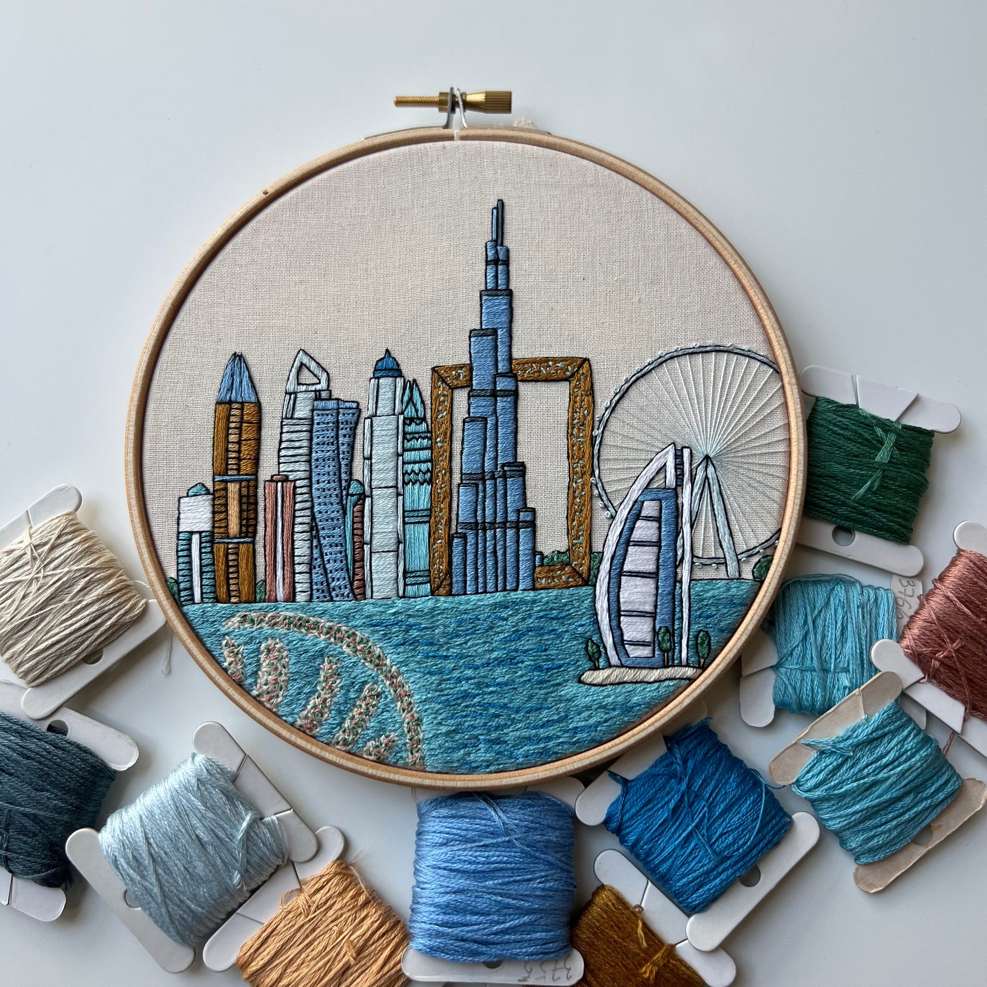 Hand embroidery PDF pattern of Dubai, United Arab Emirates with a thorough embroidery guide.