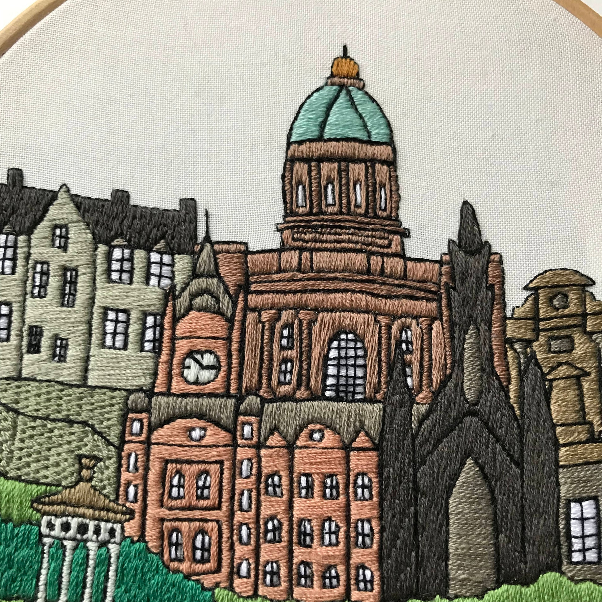 Hand embroidery pattern of Edinburgh, Scotland, United Kingdom + thorough embroidery guide.
