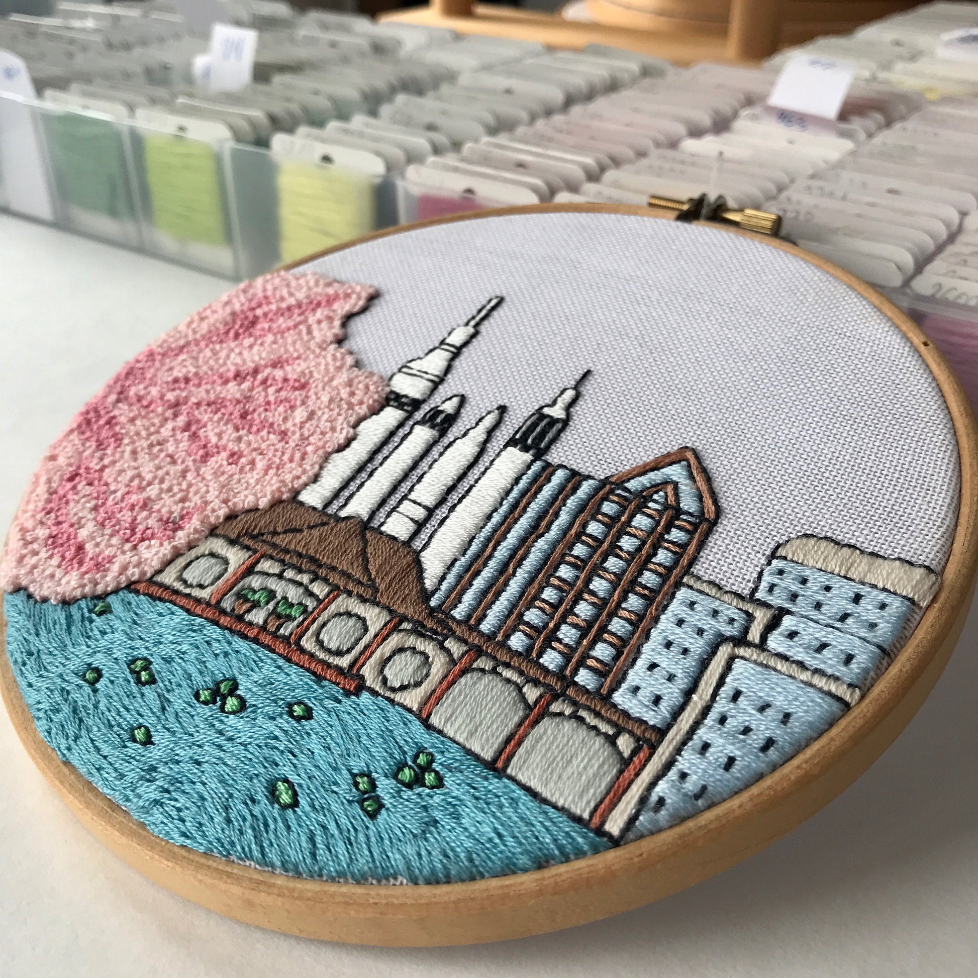 Hand embroidery pattern of Huntsville AL, United States with a thorough embroidery guide.