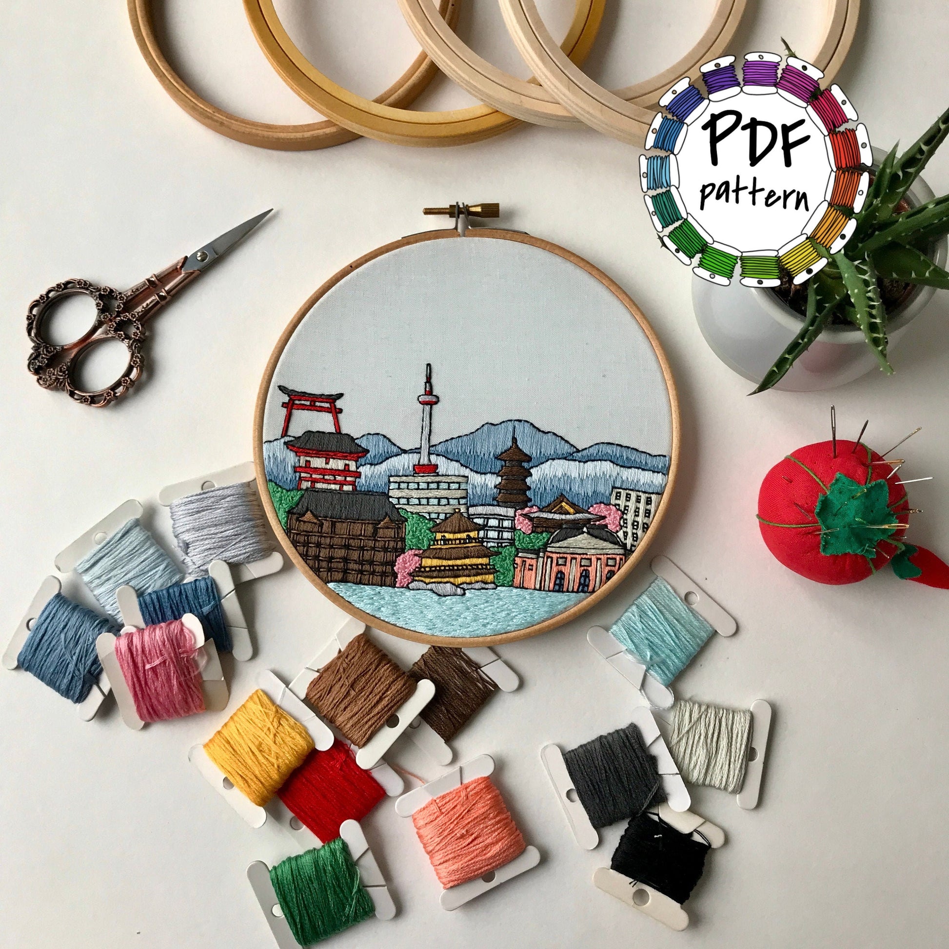 Hand embroidery pattern of Kyoto, Japan + thorough embroidery guide with video tutorials.