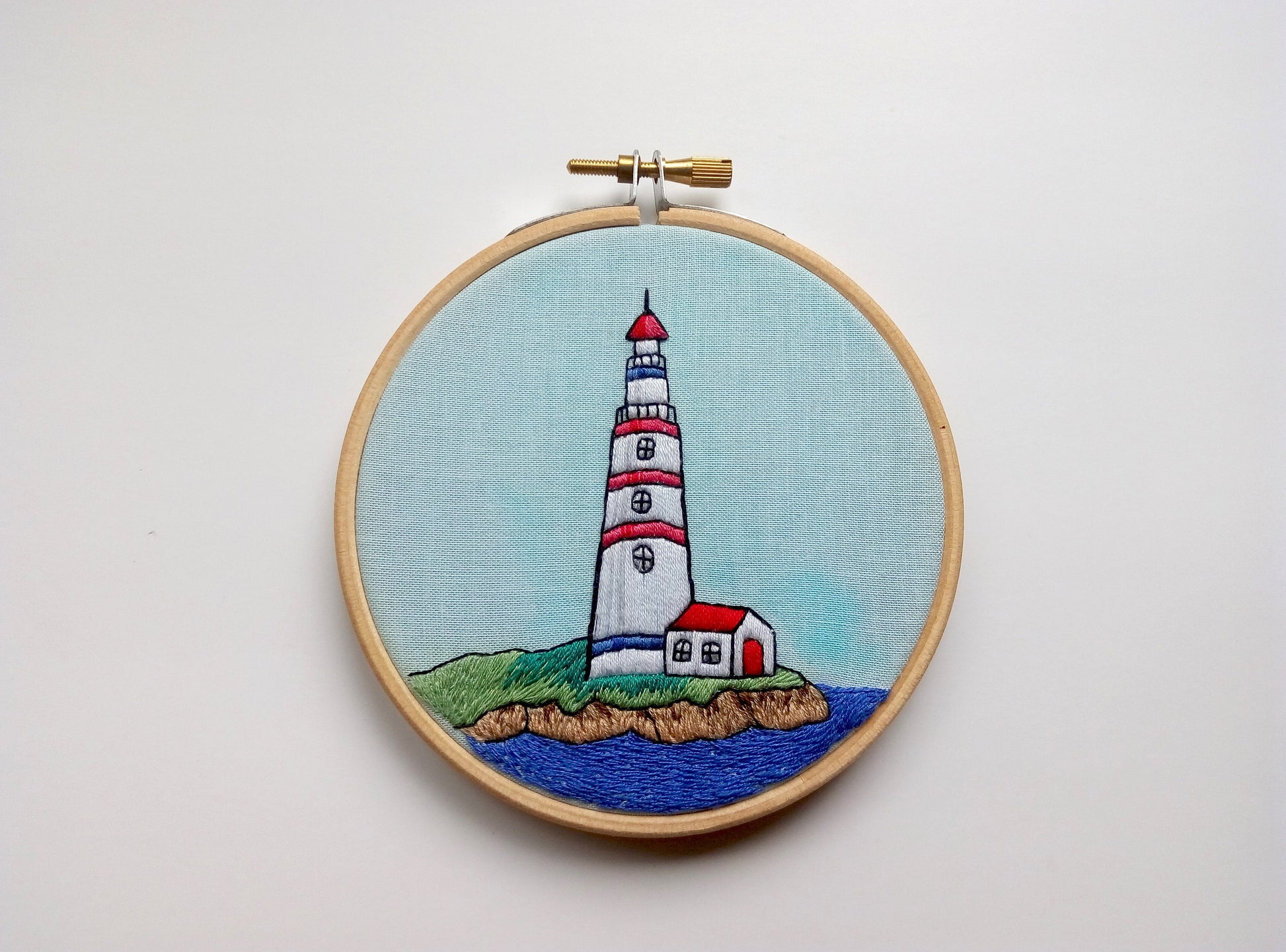 Hand embroidery pattern of a lighthouse with a thorough embroidery guide.
