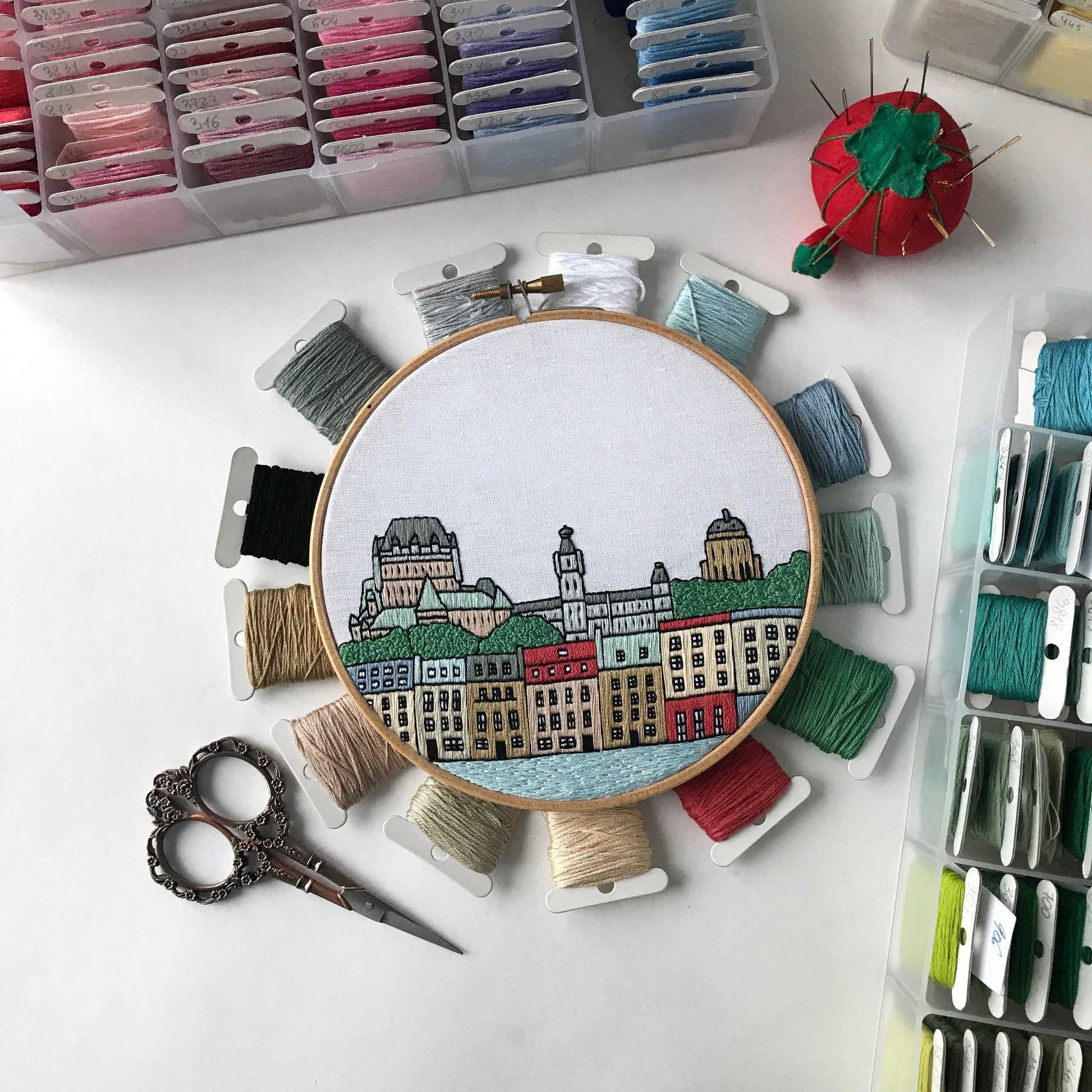 Hand embroidery pattern of Quebec, Canada with a thorough embroidery guide.