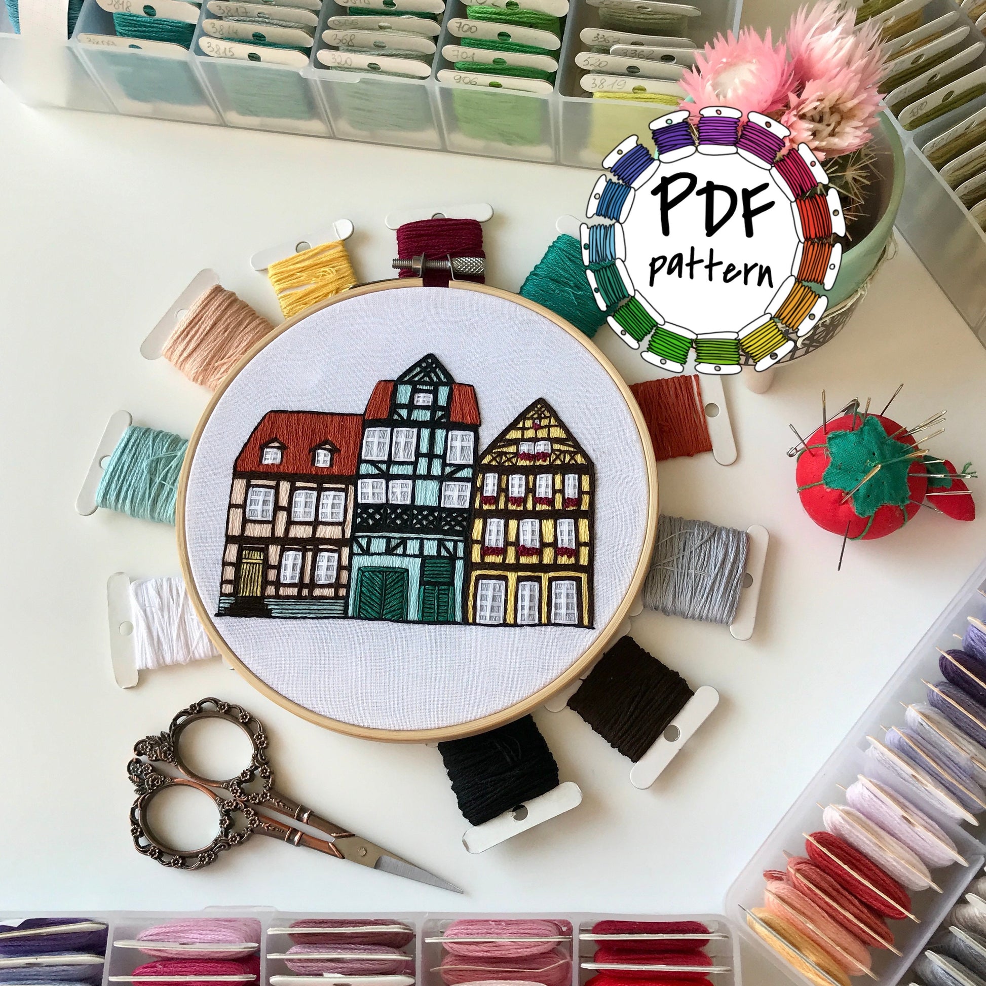 Hand embroidery pdf pattern featuring the beautiful half-timbered houses of Quedlinburg. Create stunning embroidery of these amazing buildings with my step-by-step instructions.