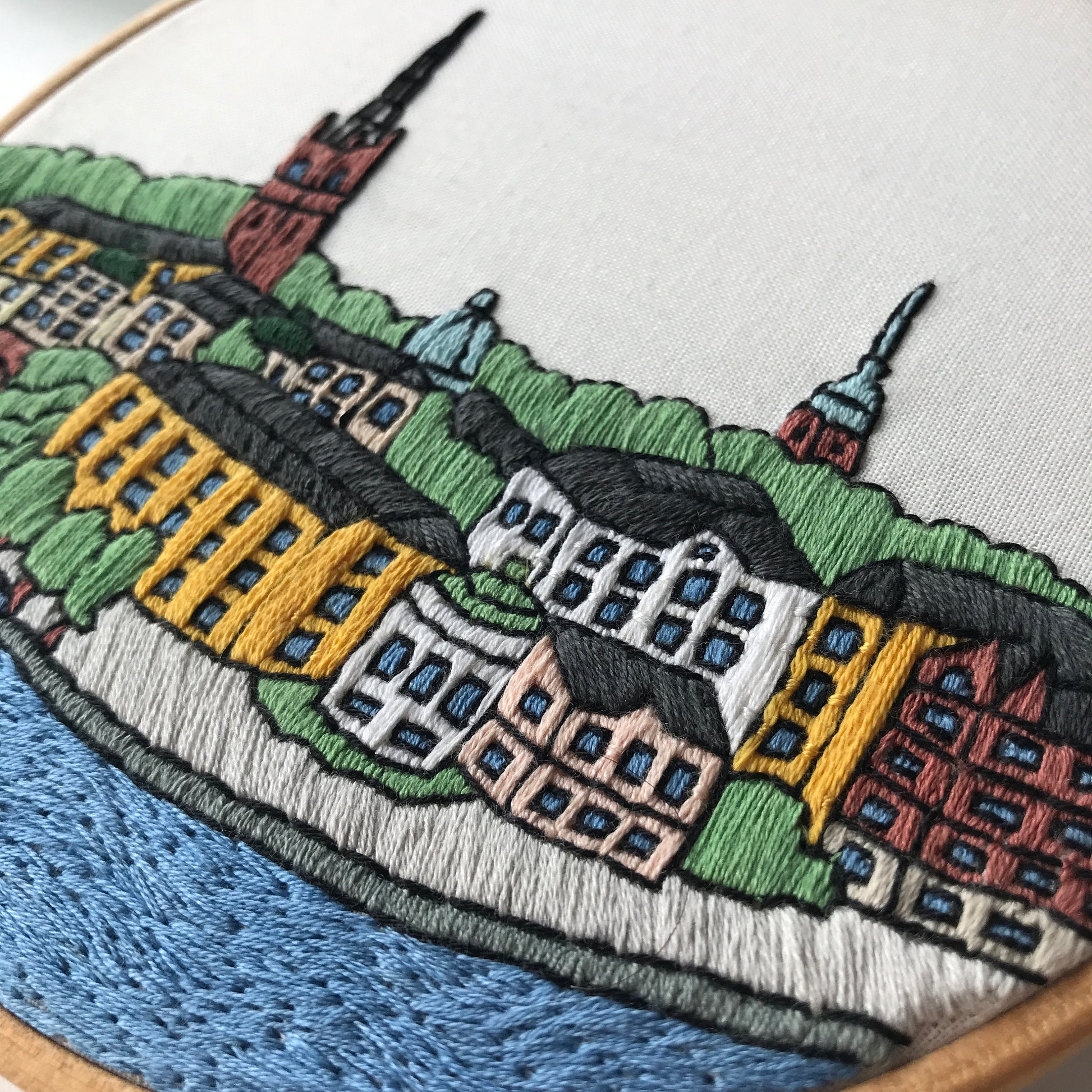 Hand embroidery pattern of Stockholm, Sweden + thorough embroidery guide.
