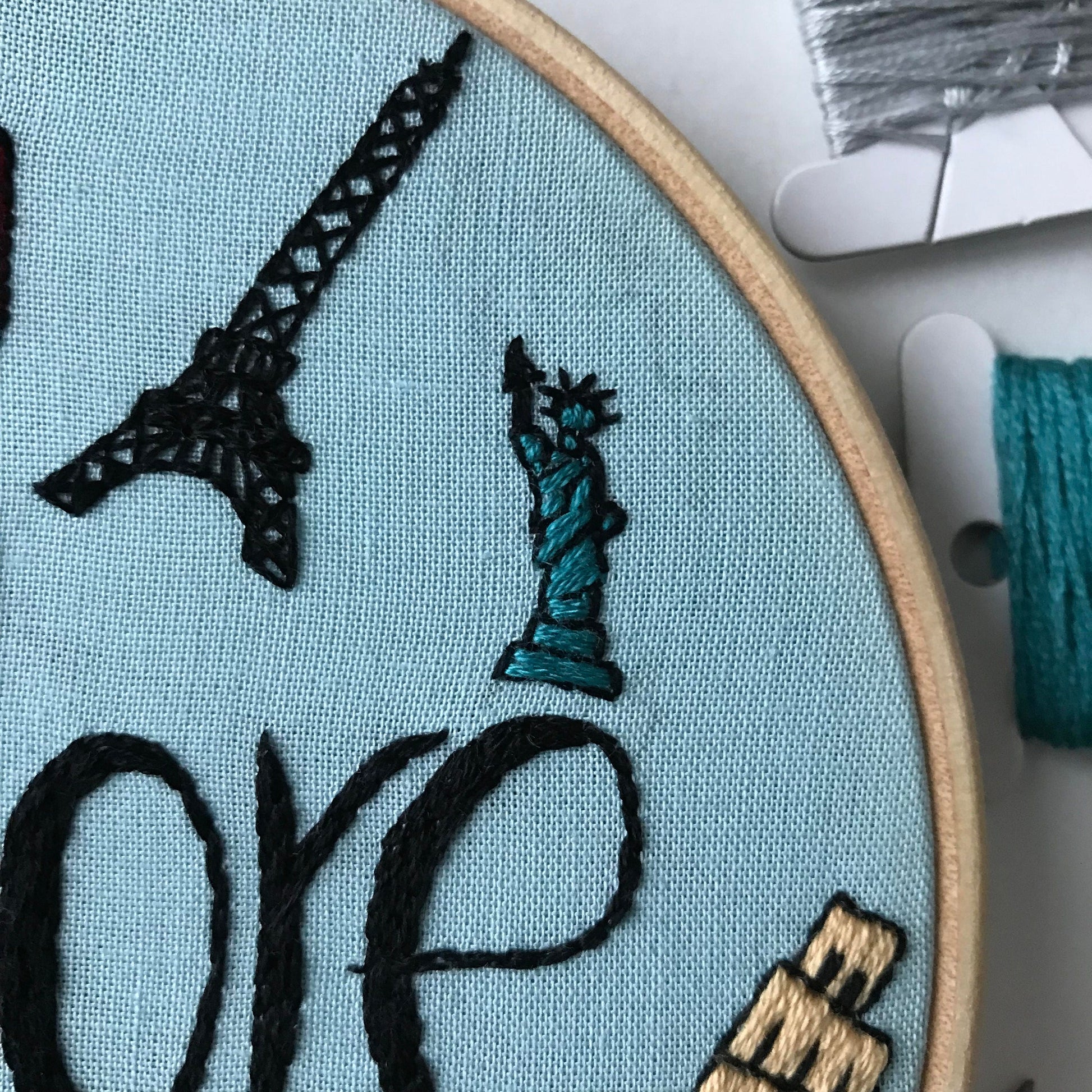 Hand embroidery pattern "Explore the world" with a thorough embroidery guide for enthusiasts of all skill levels.